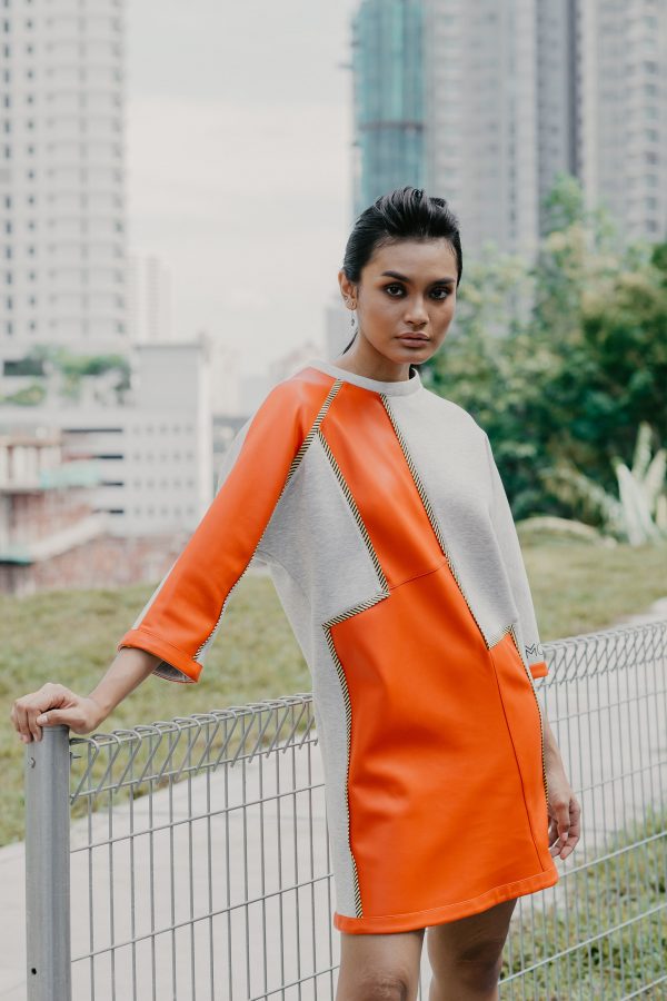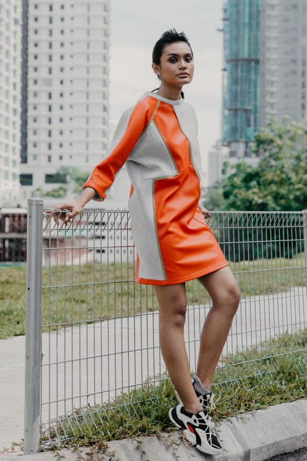 Duo Fabric Neoprene Dress Jumper (Grey Neoprene And Red PU Leather)