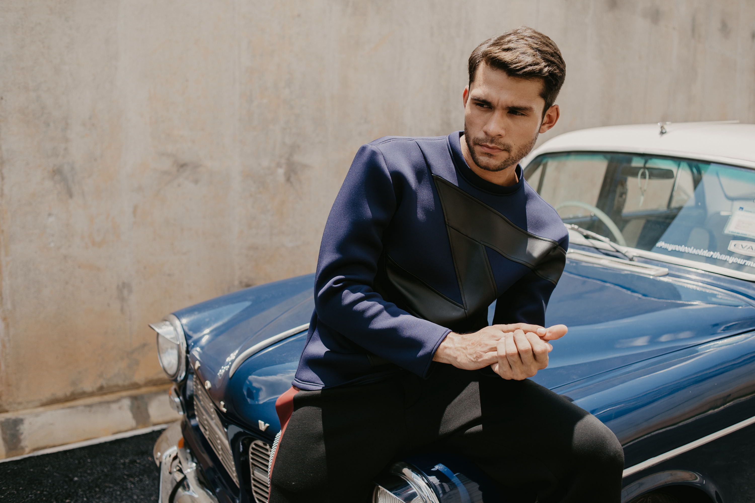 A simple and comfortable jumper that is created with the inspiration of minimalism, architecture and futuristic elements. This piece is created with the use of Navy Blue neoprene and bold Jet Black leather to enhance that edgy can be minimalistic and comfortable at the same time. This piece is well suited for an effortless casual date to a semi formal events.