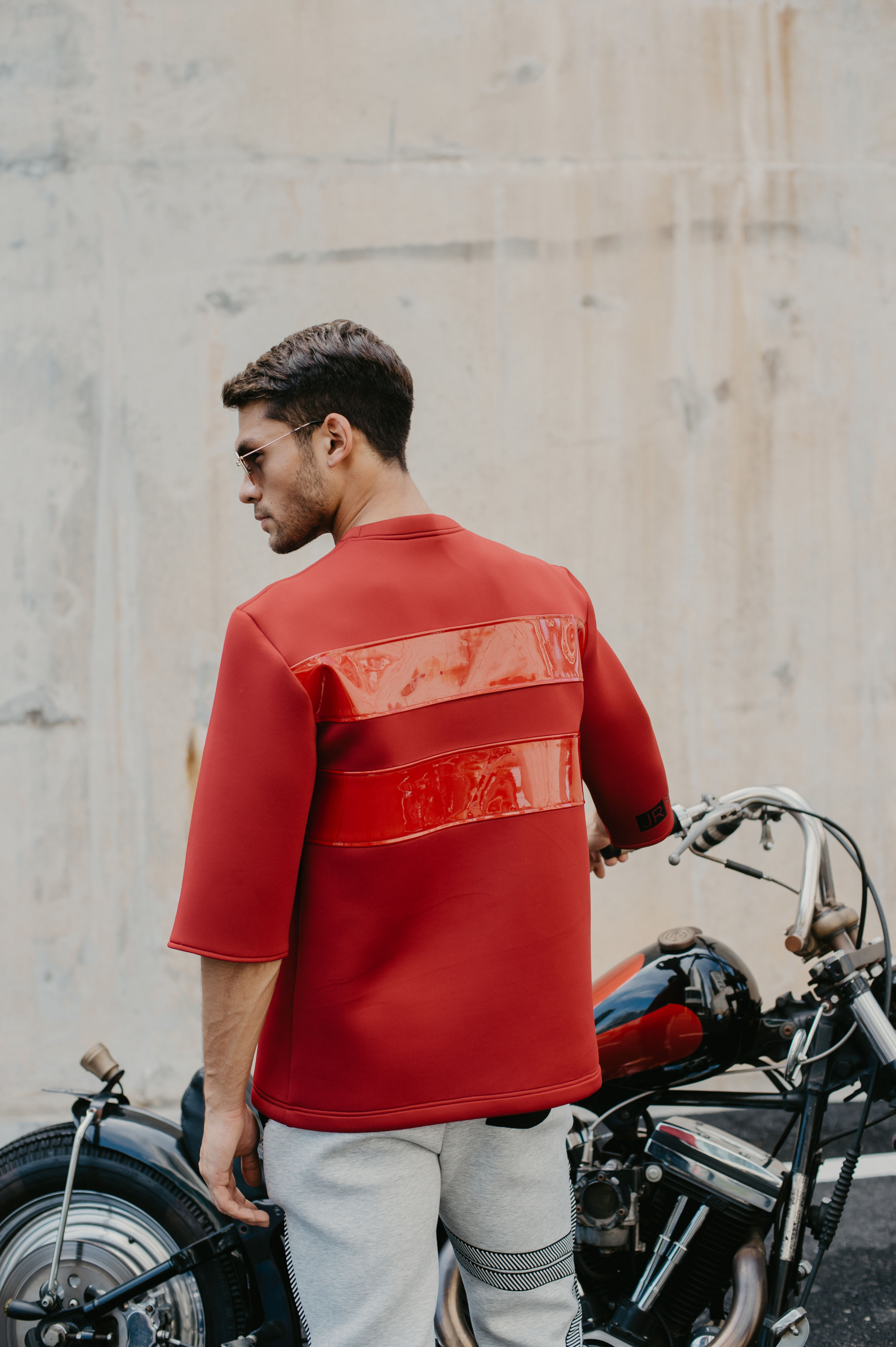 A ¾ jumper sleeve that is inspired by minimalism and architecture with a touch of futuristic. Fiery Red and Glossy Red are mixed together to create a edgy yet marvelously simple look. This piece is well suitable for a dinner date or a causal event.