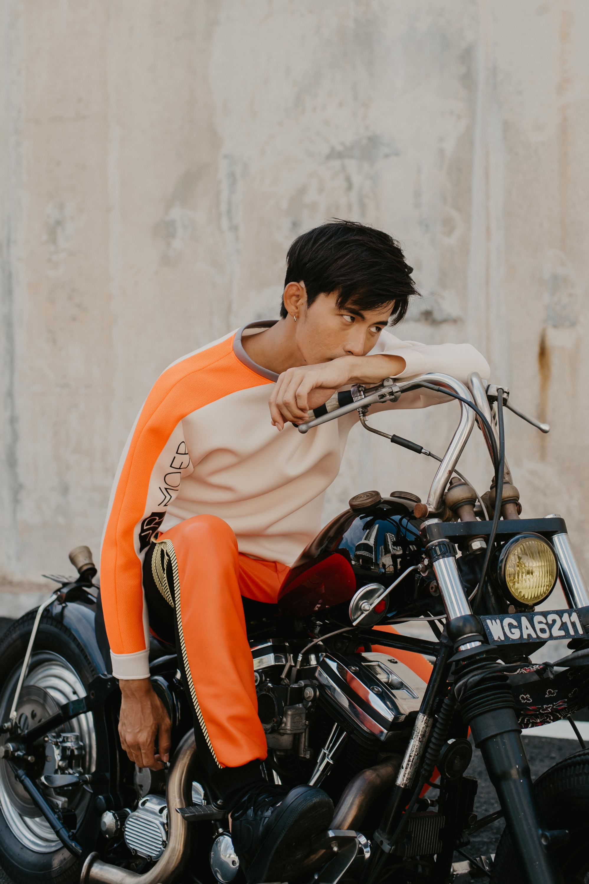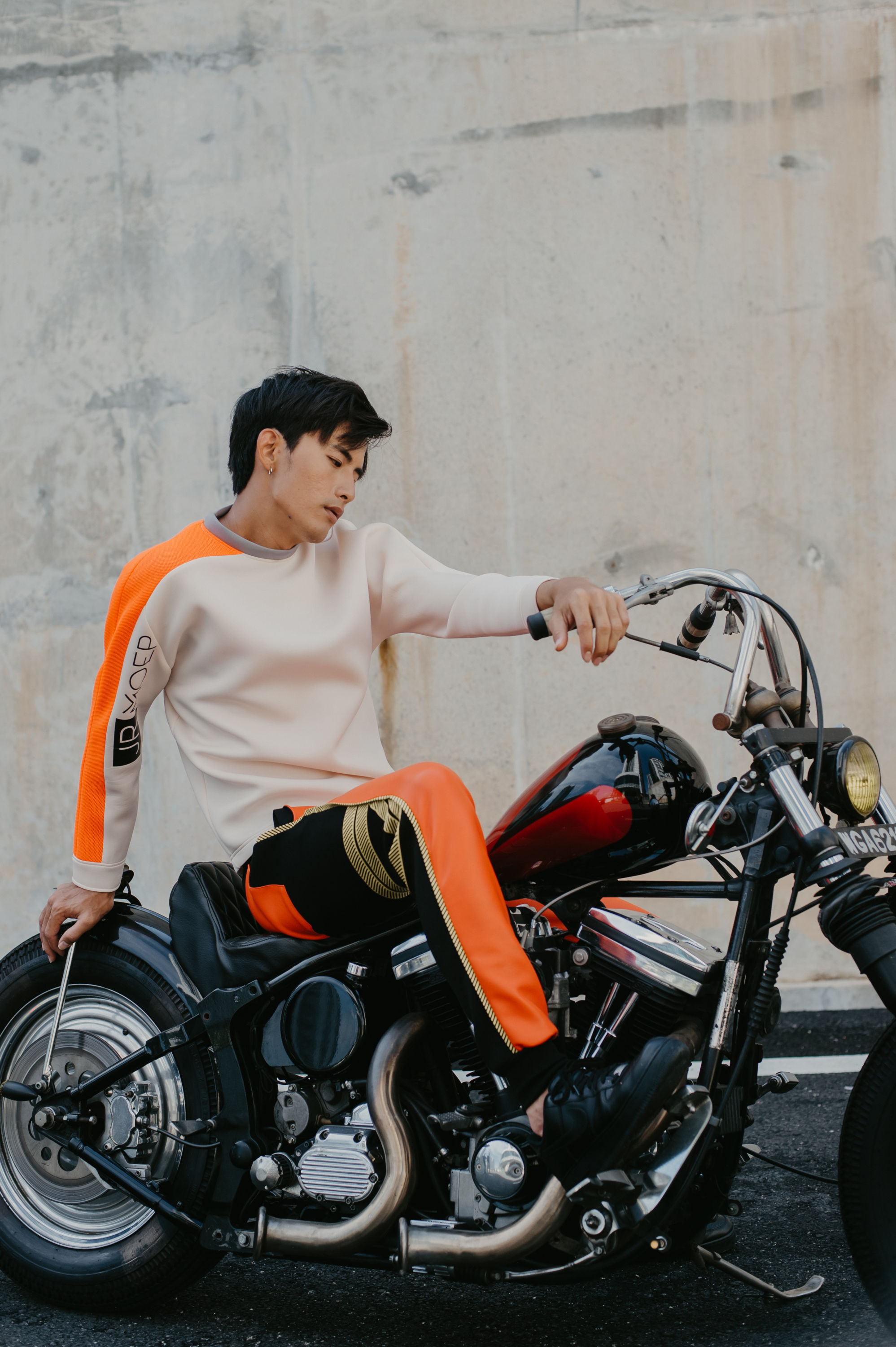 An orange tinted jumper that is inspired by minimalism and architecture with a touch of futuristic. A cheerful neon orange neoprene used with the combination of relaxing cream to create a uniqueness with the light grey detailing. Well suitable for a semi formal events and a casual stroll